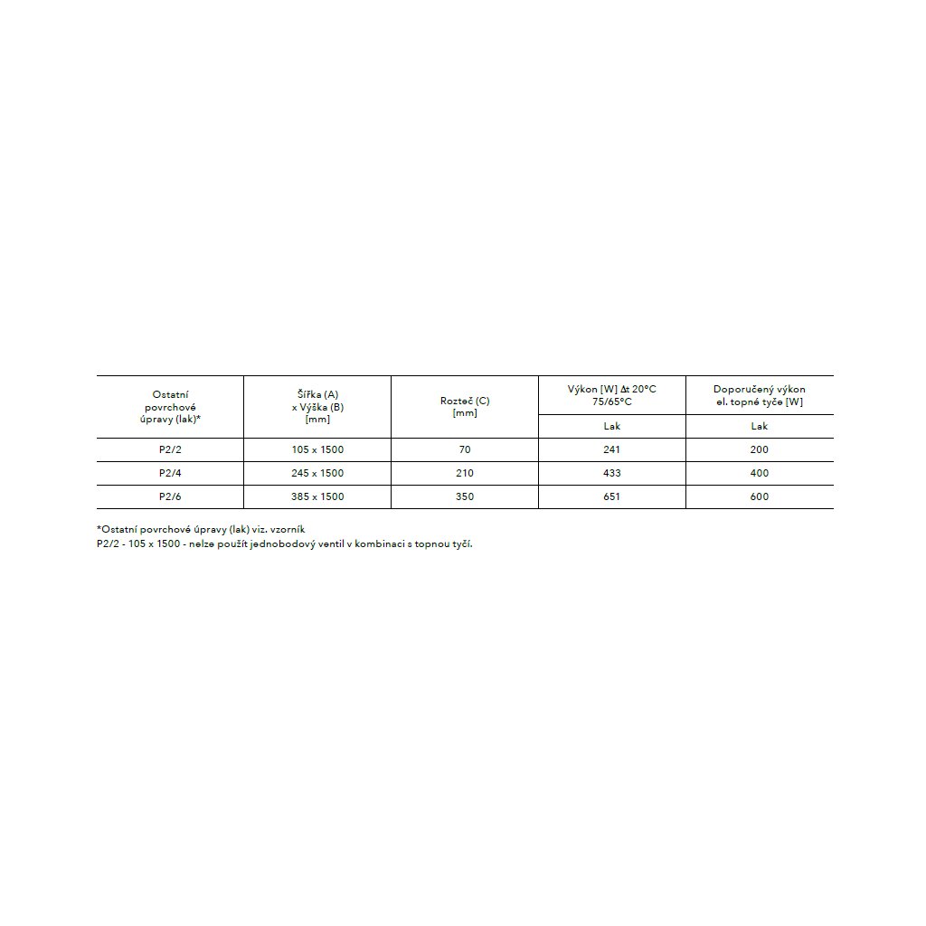Důležité: Topná tyč ani připojovací ventil nejsou součástí koupelnového radiátoru – s jejich výběrem vám rádi poradíme. U 2 trubkové varianty P2/2 nelze použít jednobodový ventil v kombinaci s topnou tyčí.